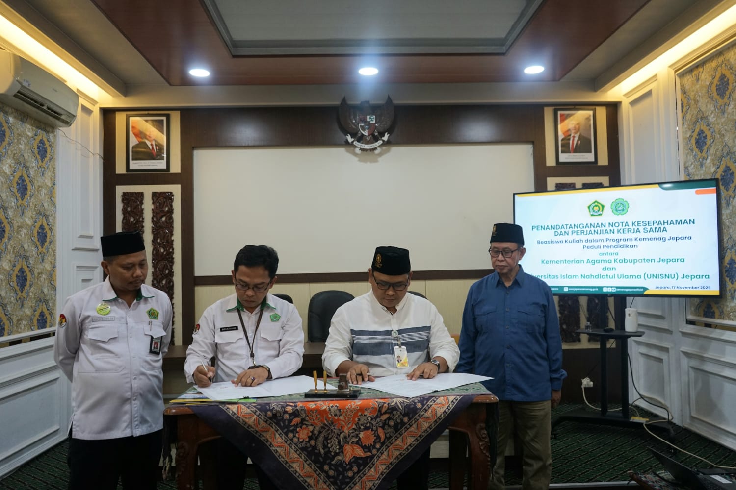Jepara — Kementerian Agama Kabupaten Jepara melakukan penandatanganan nota kesepahaman dan perjanjian kerja sama dengan Universitas Islam Nahdlatul Ulama (UNISNU) tentang beasiswa kuliah dalam program Kemenag Jepara Peduli Pendidikan. Kegiatan panandatanganan tersebut berlangsung di Aula II Kankemenag Jepara, Senin (17/11/2025).