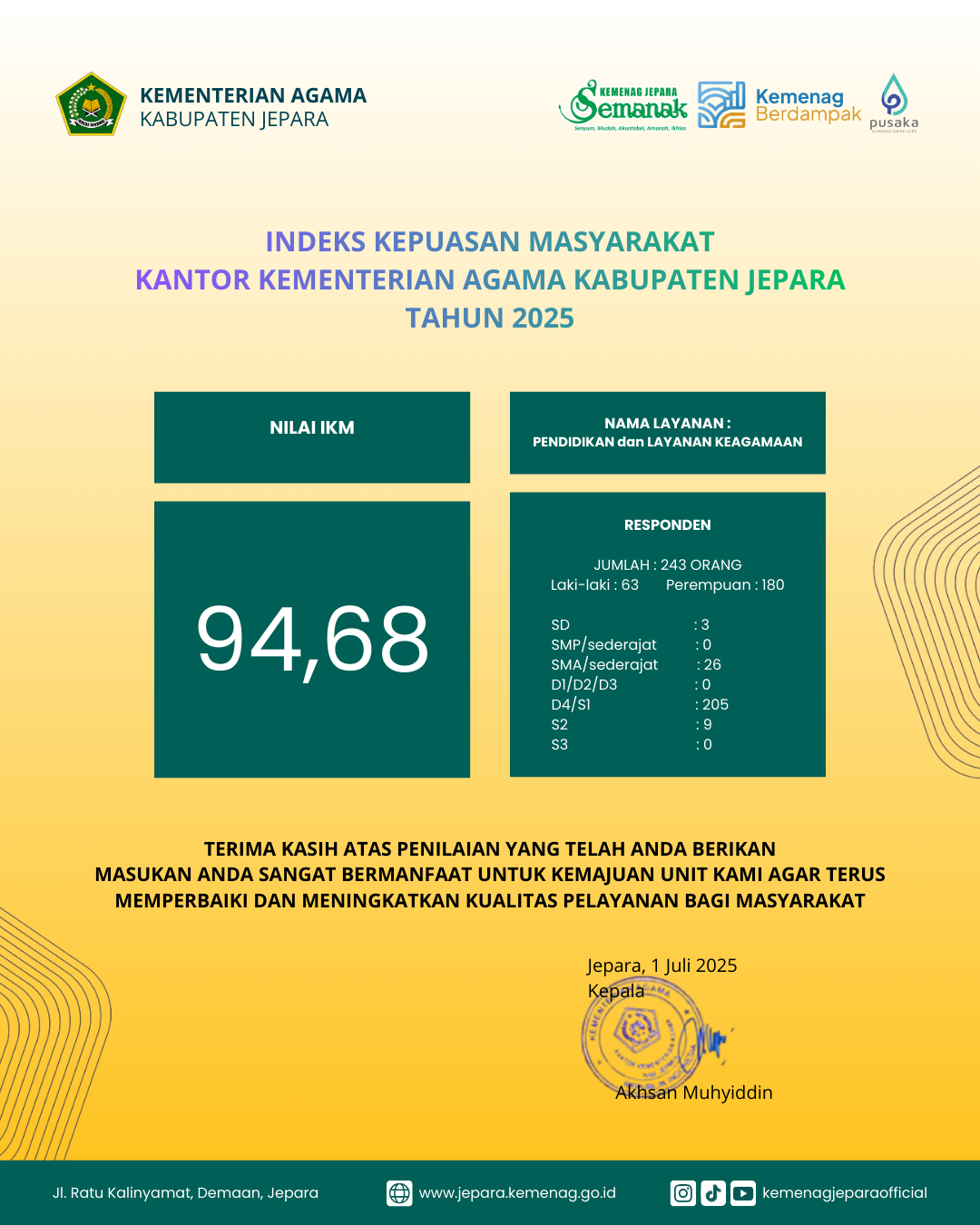 Terima kasih atas penilaian dan masukan yang telah diberikan. Setiap saran Anda menjadi dorongan bagi kami untuk terus meningkatkan pelayanan pendidikan dan pelayanan keagamaan. Mari bersama wujudkan layanan Kemenag yang semakin profesional dan berdampak.