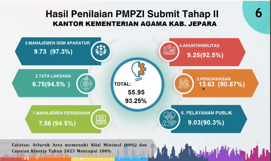 Berdasarkan hasil penilaian tersebut, Kantor Kementerian Agama Kabupaten Jepara berhasil meraih peringkat ke-6 se-Kemenag kabupaten/kota se-Jawa Tengah. Capaian ini sekaligus mengantarkan Kemenag Jepara untuk diusulkan sebagai Satuan Kerja Calon Pilot Project Zona Integritas Tahun 2026.
