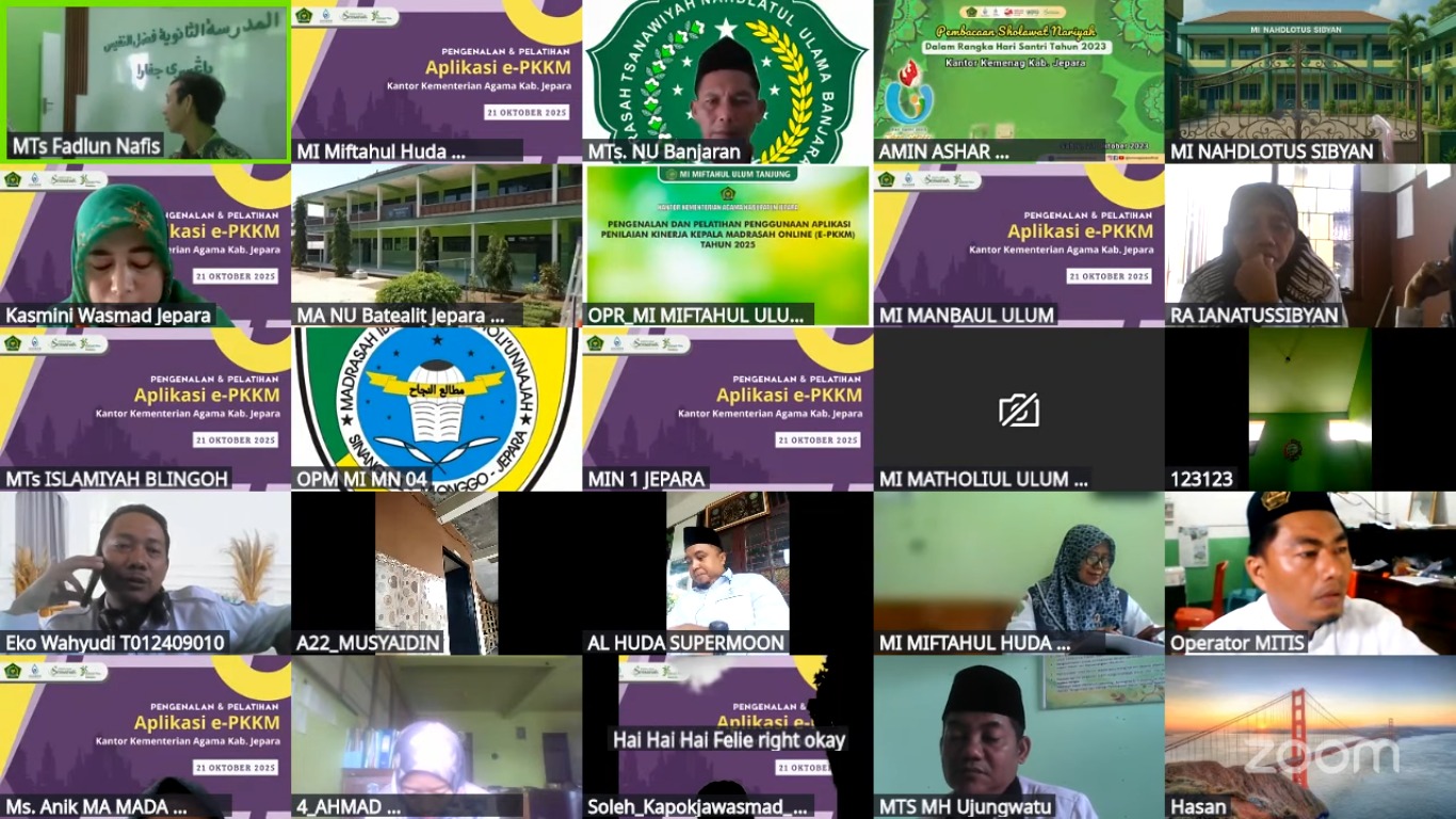 Jepara — Kantor Kementerian Agama Kabupaten Jepara menggelar kegiatan launching dan sosialisasi aplikasi penilaian kinerja kepala madrasah berbasis daring melalui Zoom Meeting, yang diikuti oleh seluruh pengawas, kepala madrasah, serta tenaga kependidikan madrasah se-Kabupaten Jepara, Selasa (21/10/2025).