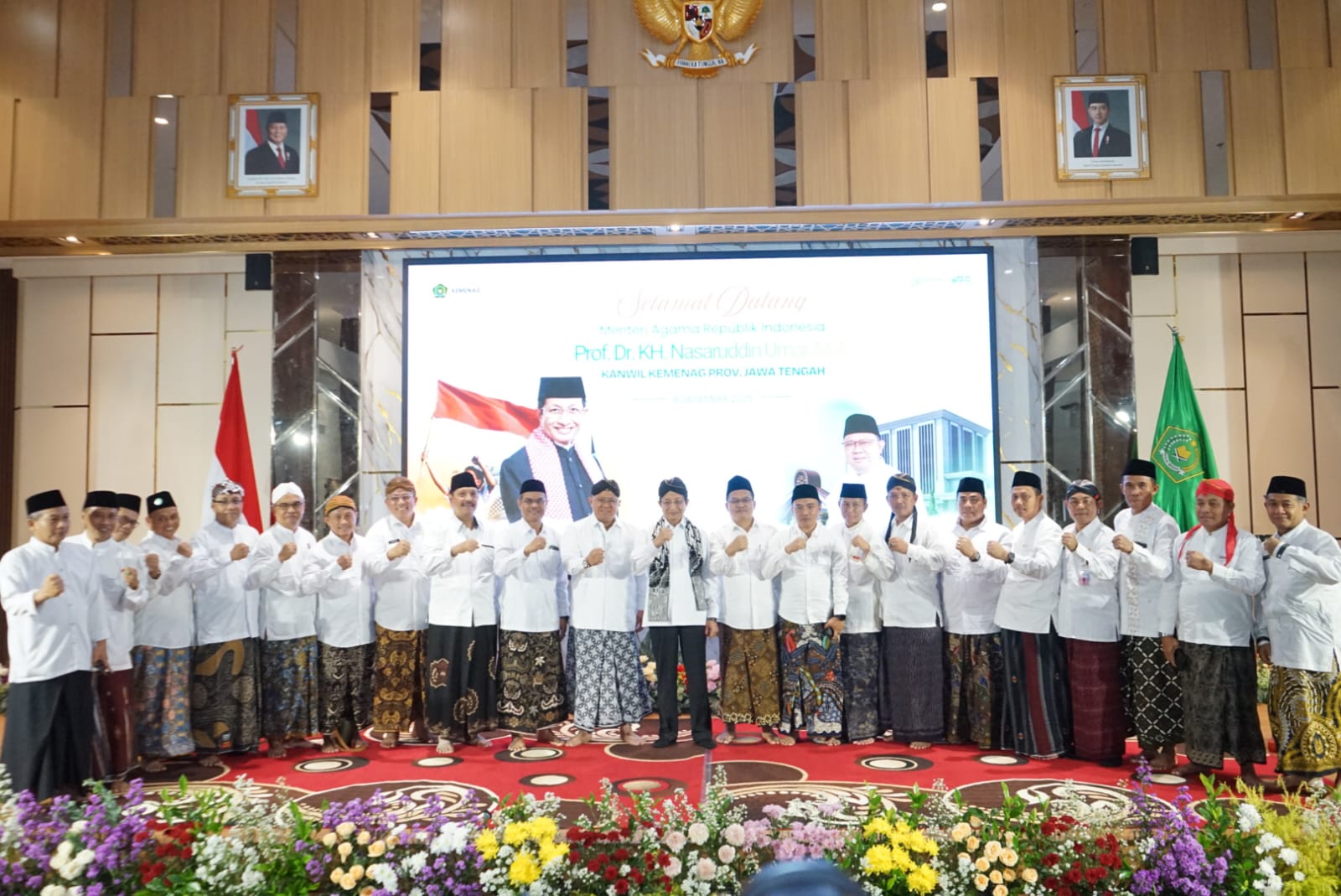 Semarang — Menteri Agama Republik Indonesia Nasaruddin Umar memberikan Tausiyah Kebangsaan dalam kegiatan yang digelar di Kantor Wilayah Kementerian Agama Provinsi Jawa Tengah pada Senin (8/12), yang diikuti oleh ribuan ASN Kemenag. Pada kesempatan tersebut sekaligus dilakukan peresmian gedung baru Kanwil Kemenag Provinsi Jawa Tengah. Kepala Kankemenag Kabupaten Jepara Akhsan Muhyiddin beserta Kasi Bimas Islam Samsul Arifin turut menghadiri kegiatan tersebut.